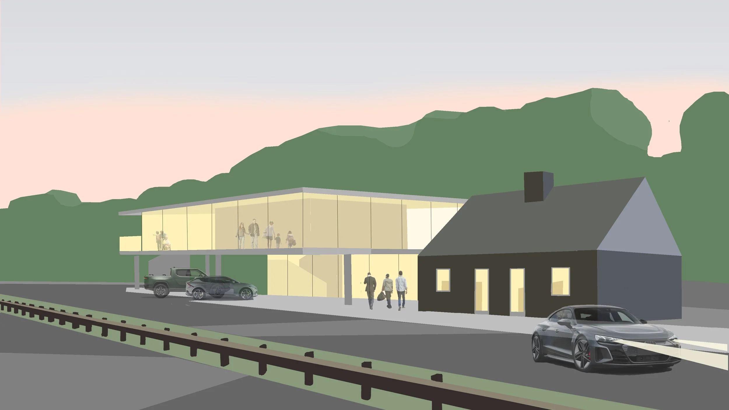 This prototype could be applied to existing parkway stops across the northeast. This type of rest stop is evolving its design as electric vehicles are accommodated. Unfortunately these changes are often limited to adding a few charging stations without improving places to wait while charging. The original building has some additions that can be removed to provide the new elevated cafe above the charging stations since site area is limited., while preserving the original building as a convenience store. As with the Thruway service areas, local food and tourist information can be emphasized.
